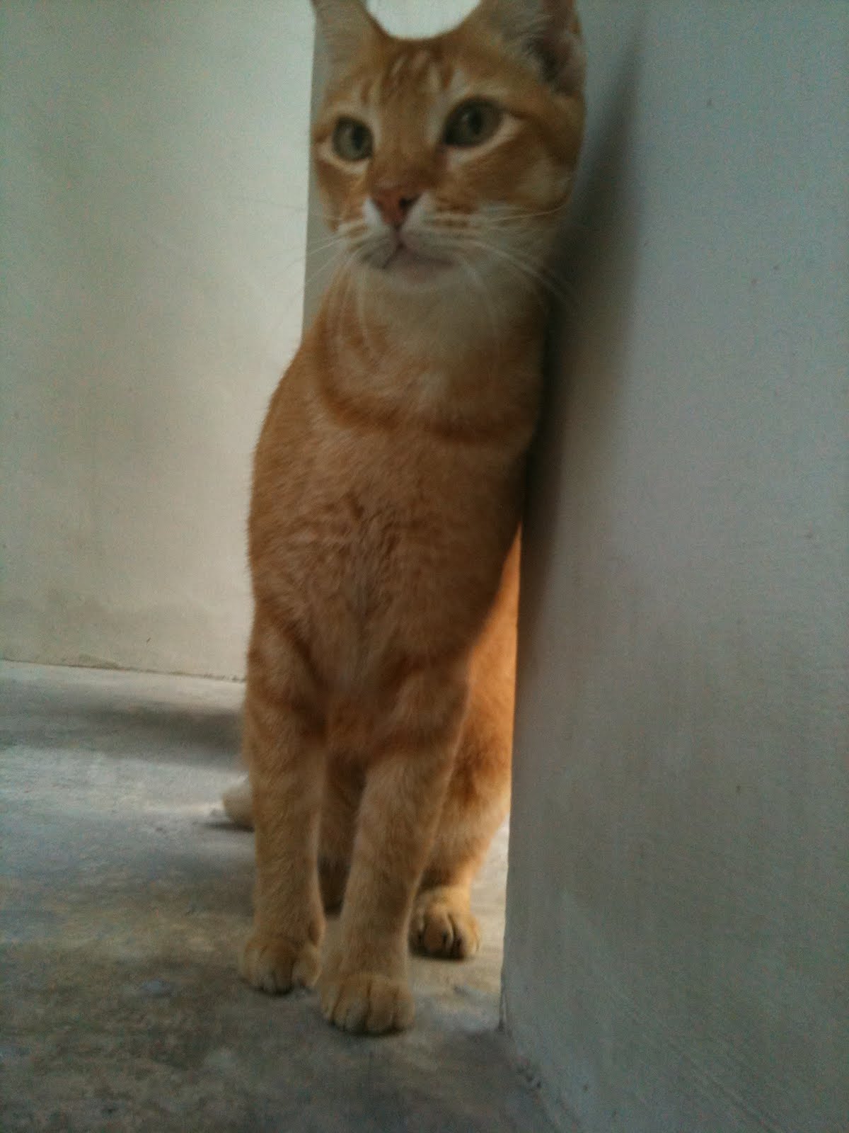 Kunyit is still yearning for affection and would wait for a caregiver every morning, not for food but just to see and hear a "friend". After so many years of surviving on the "streets", he has lost complete trust in human beings to be allowed to be touched but he would rub against the wall and drainage pipe, because he was too wary to rub against the caregiver's legs.
