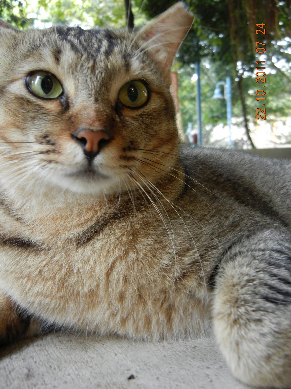 He became a well loved cat, sitting or lying on the cement floor at the back gate of the school, welcoming kids and some kids, especially Malays, would squat and "sayang" him.